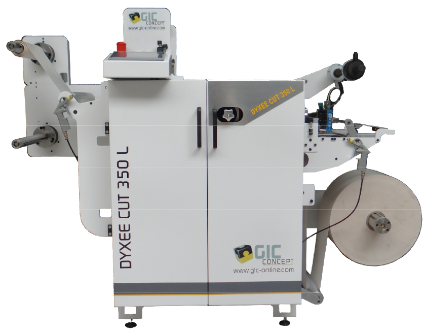 The DYXEE CUT 350 L embellishment and finishing solution, is a semi-rotary die-cut module for adhesive labels. A particular attention has been given to the ease of use and the optimization of the setup and make-ready times. This equipment is ideal to complete colour digital printers. The DYXEE CUT 350 L, is versatile and can be fitted with different optional devices. BASIC CONFIGURATION • 1 Unwinder • 1 Semi-rotary die-cut o Max. length continous die-cut: 16” o Max. length semi-rotary die-cut: from 3 to 13” o 1 matrix removal with servo driven roller o Quick set up con auto register • 1 Slitting system • 2 Rewinder o 2 pneumatic shafts Ø 76 mm o Ø 500 mm max. in simple configuration o Ø 330 mm max. in double configuration TECHNICAL CHARACTERISTICS • Web width: 350 mm • Speed: 50 m/min • Paper weight: 50 à 200 microns • Substrates: adhesive • Unwinder max. reel diameter: 500 mm • Semi-rotary die-cut with a 16’’ cylinder • Possible rotary die-cut • Label counting • Matrix rewinder • Slitting system with 3 blades • Rewinder max. reel diameter: 500 mm OPTIONS • Lamination • On-line kit on-line for Konica Minolta C71cf printer • Flexographic unit • Creajet® digital ink jet bar • Hot stamping • Cold stamping • Inspection camera • Selective varnish • Ultrasonic web guide