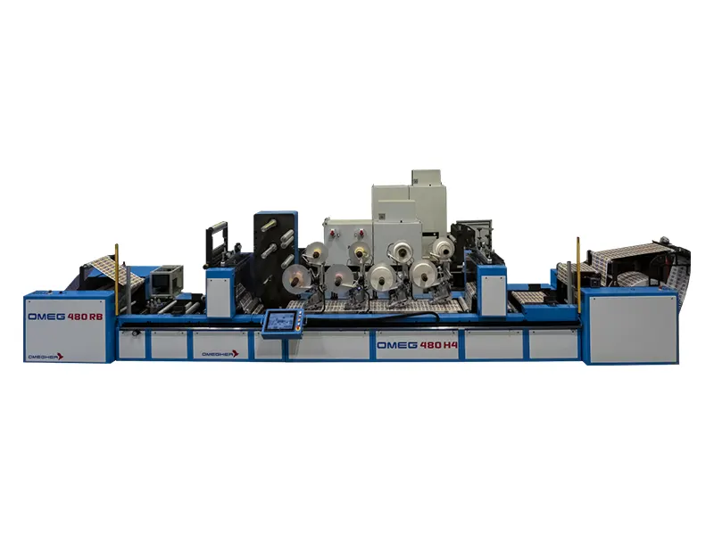 The OMEG 480 H4 machine processes adhesive and non-adhesive paper, neutral or printed, with a width of 480 mm at a maximum speed of 150 m/min. This machine has its own electrical panel and is equipped with a sliding touch screen for executing commands.